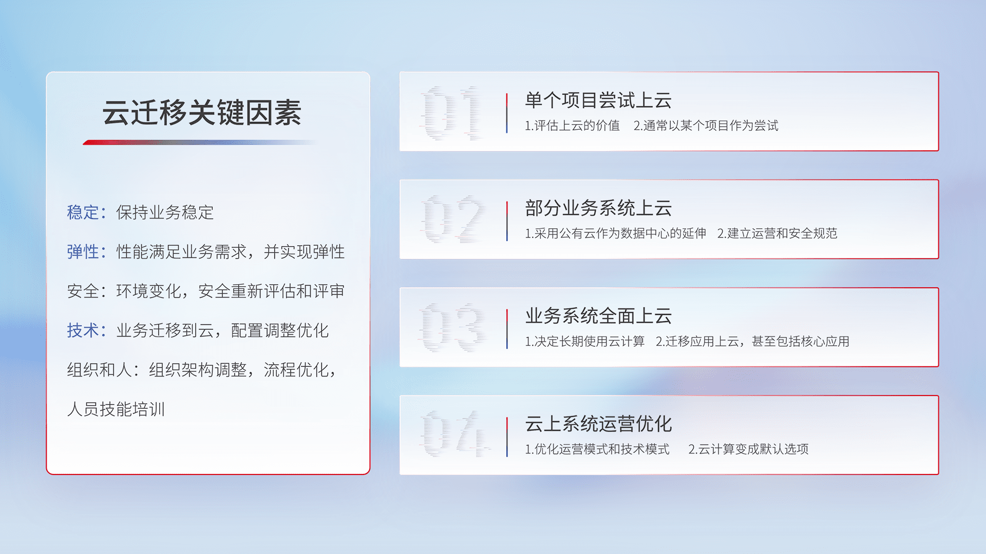 结合实际业务,,从规划设计、、云平台选型、、、、云原生改造、、、、数据迁移、、、、集成交付,,,,迁移全过程为客户识别最佳上云路径,,做好风险识别管理,,,设计网络架构、、、身份权限、、、安全审计合规、、、、操作审计、、、、日志审计、、监控告警策略、、多站点容灾设计等,,对云上基础设施进行整体规划,,,,提升IT治理水平,,以满足弹性、、高可用、、高性能的需求。。。。