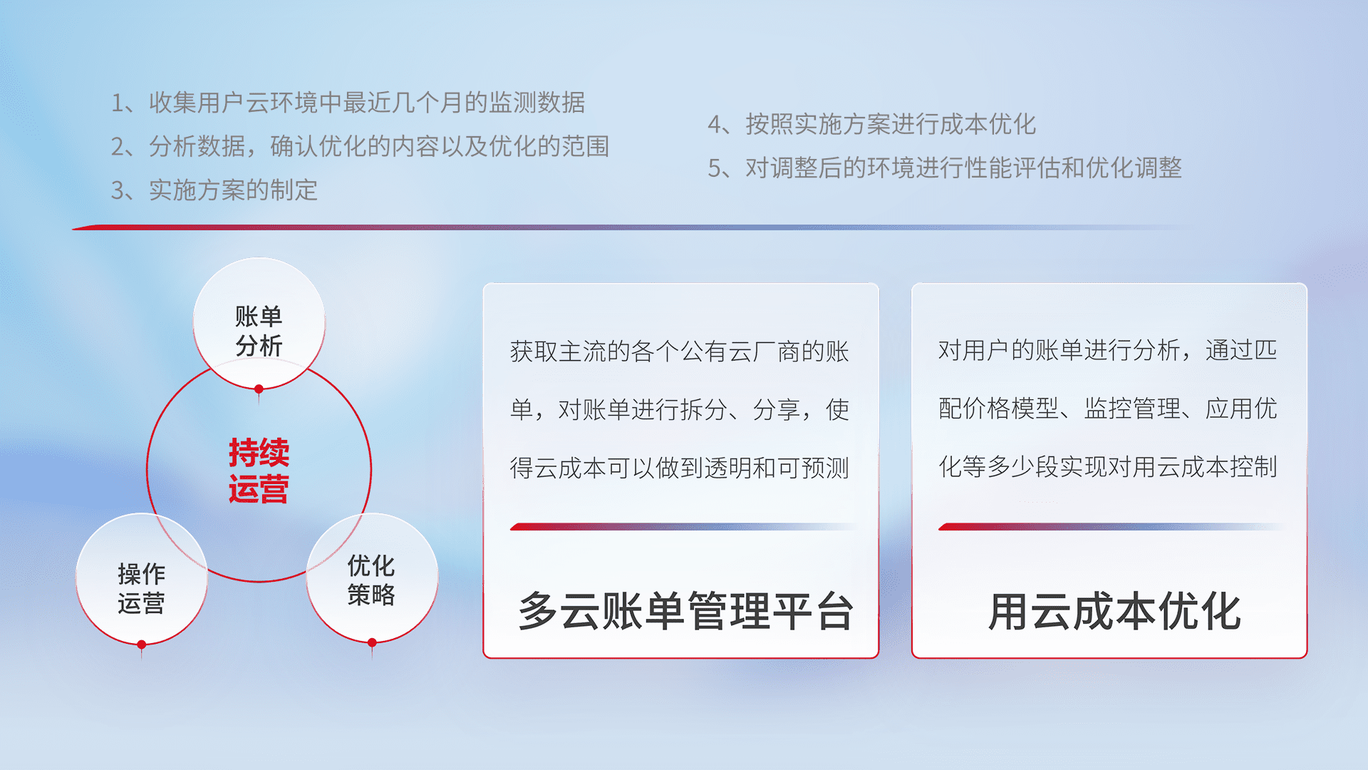 通过多云纳管,,,以统一的资源数据模型把客户的云资源进行抽象和封装,,,,进而实现对多云资源的统一操作,,,,保障云资源管理的可靠性、、、稳定性与可用性。。量身定制化运维内容,,,,配置、、、开发运维、、、补丁管理、、、、备份、、监控、、、、认证和访问管理、、、、审计和日常巡检等,,,,保障在用云过程中的可靠度,,,,稳定度以及高可用率。。。