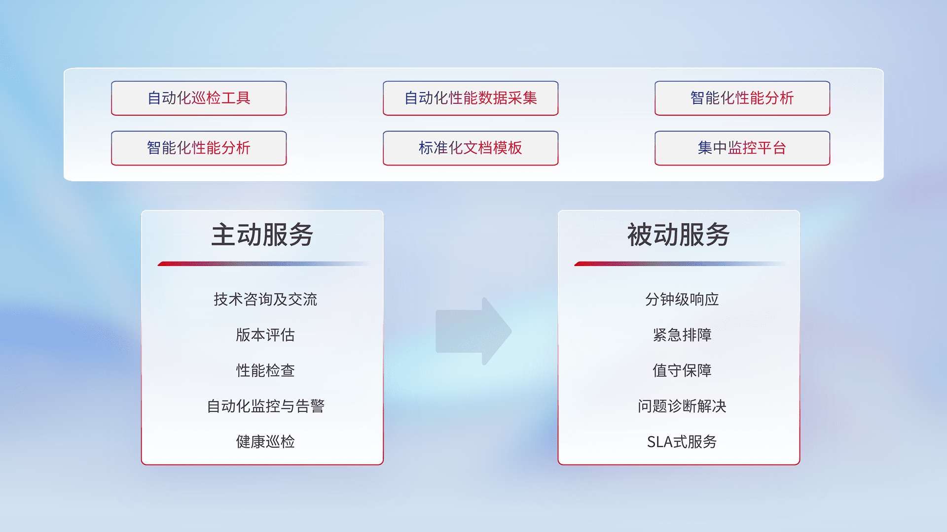 智能化工具和标准化文档,,,,保障服务质量,,,提供主动服务(包含技术咨询、、版本评估、、、性能检查、、、、自动化监控与告警、、、、健康巡检)和被动服务包含(分钟级响应、、、、紧急排障、、、值守保障、、、问题诊断解决、、SLA服务)。。